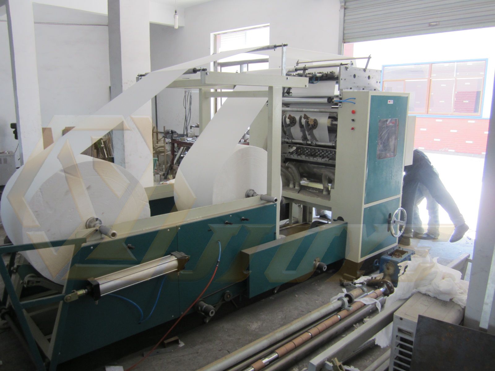 2.設備是將分切后的原紙經螺旋刀輥剪切,互扣式折疊成鏈式的長方形面巾紙.
